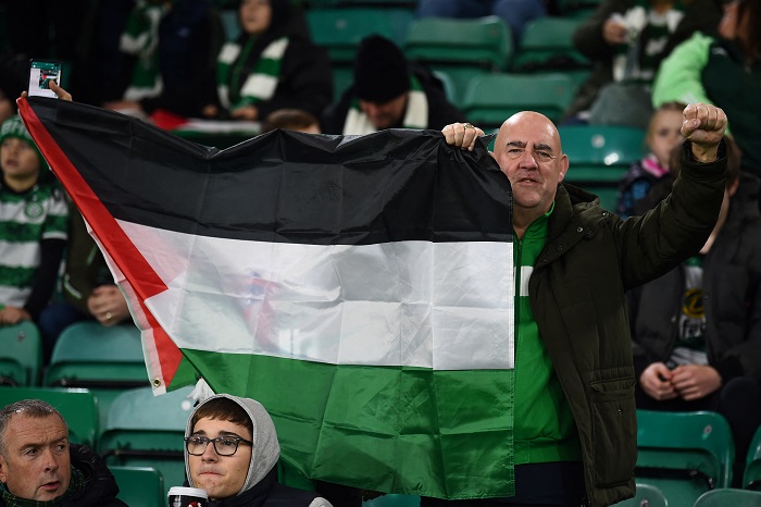 إدنبرة 26-10-2023 وفا- رفع جمهور نادي سلتيك الاسكتلندي لكرة القدم، الليلة، العلم الفلسطيني في مباراة الفريق البيتية أمام أتليتكو مدريد الإسباني، ضمن بطولة دوري أبطال أوروبا، وذلك في إطار التضامن الشعبي العالمي مع شعبنا، والتنديد بالعدوان الإسرائيلي المتواصل على قطاع غزة.