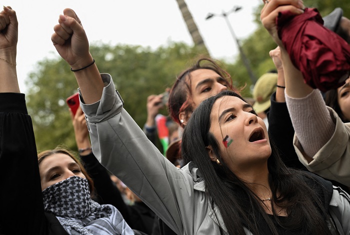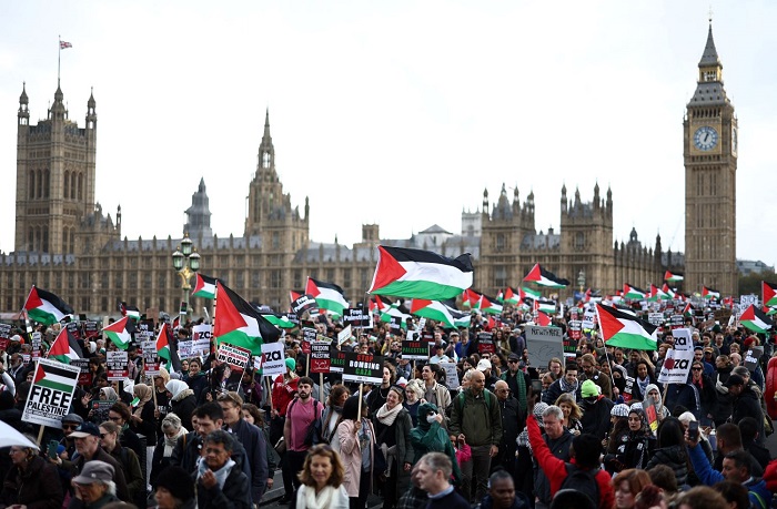 وتجمعت الحشود بالقرب من جسر اليوبيل الذهبي وسط لندن ومن المقرر أن تنتهي في ساحة البرلمان، وحملوا لافتات كتب عليها "غزة، أوقفوا المذبحة" و"فلسطين حرة، أنهوا الاحتلال الإسرائيلي".