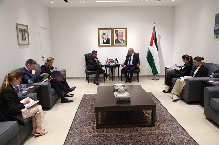 رام الله 1-11-2023 وفا- استقبل أمين سر اللجنة التنفيذية لمنظمة التحرير الفلسطينية حسين الشيخ، اليوم الأربعاء، في مكتبه برام الله، وزير الدولة البريطاني لشؤون الشرق الأوسط وشمال أفريقيا اللورد طارق أحمد.