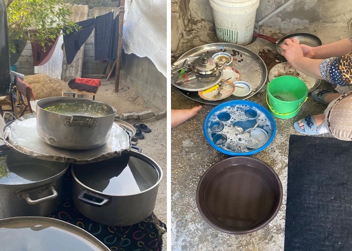 ويعيش في منزل أم مصباح عائلتها المكونة من 6 أفراد وعائلتان من شمال غزة بمجموع 19 فردا، يعيشون وسط شح في الماء.