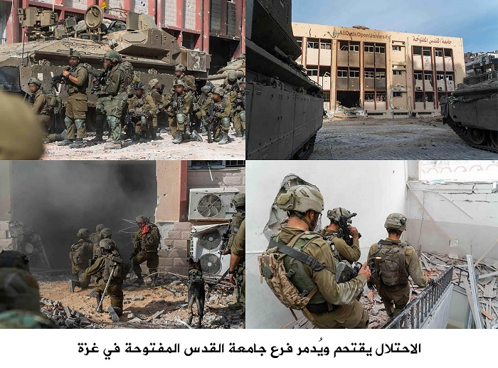 كما كان الاحتلال، وضمن حرب الإبادة الجماعية التي يُمارسها بحق أبناء الشعب الفلسطيني في قطاع غزة؛ قد اقتحم فرع جامعة القدس المفتوحة في غزة وهَدَمَ أجزاء من مبانيه، بالإضافة لقصف جامعتي الأزهر والإسلامية في وقت سابق، وتدمير عدة مبانٍ فيهما بشكل كُلّي وجزئي، وكذلك مُواصلة حملات الاعتقال بحق طلبة وأساتذة المؤسسات التعليميّة الفلسطينيّة.
