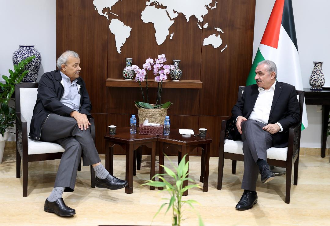 رام الله 2-11-2023 وفا- بحث رئيس الوزراء محمد اشتية مع رئيس جمعية الهلال الأحمر الفلسطيني يونس الخطيب، ومديرها العام مروان جيلاني، اليوم الخميس، في مكتبه برام الله، الجهود الإغاثية التي تقودها الجمعية في قطاع غزة.