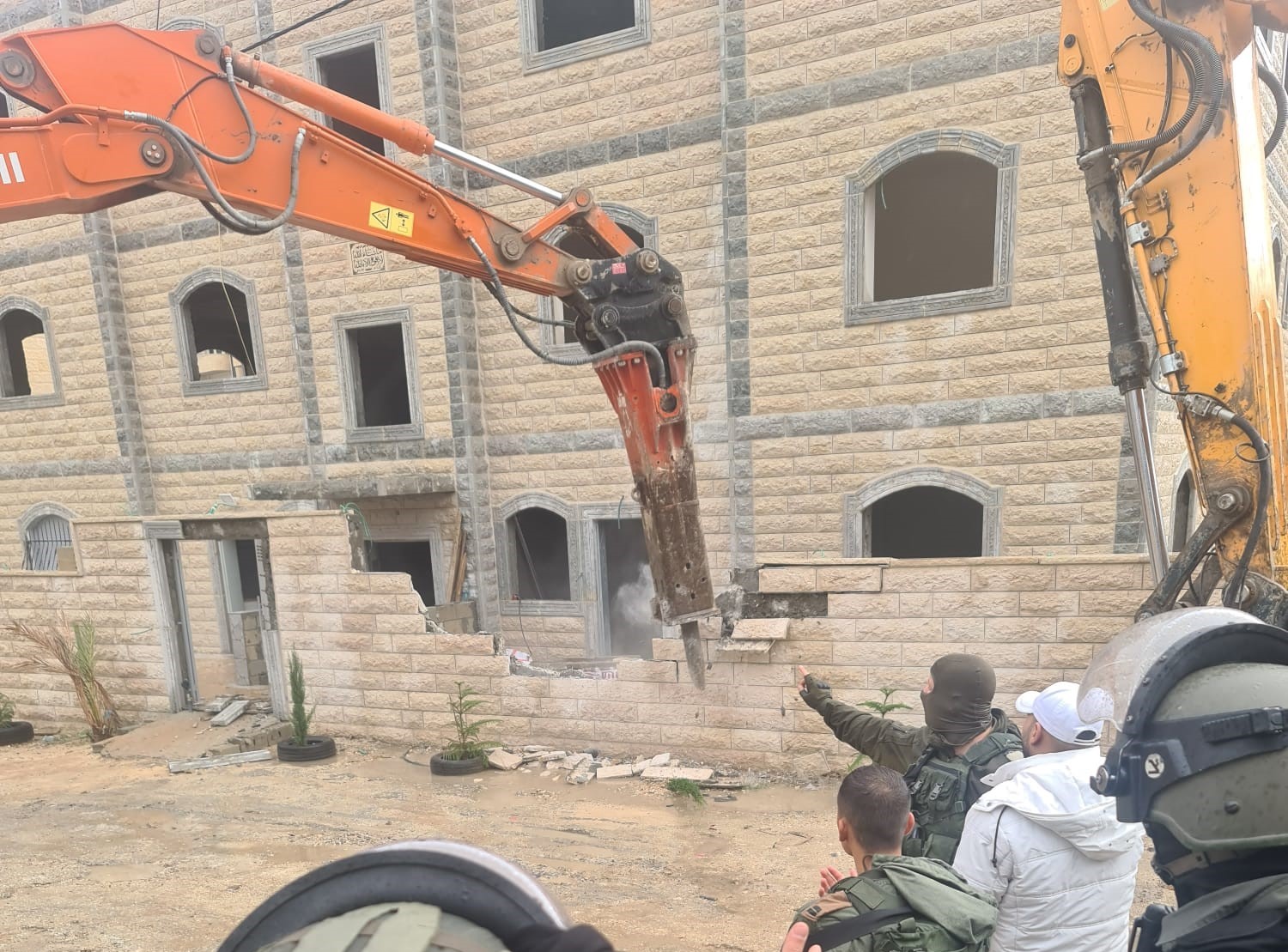 القدس 20-11-2023 وفا- شرعت سلطات الاحتلال الإسرائيلي، اليوم الإثنين، بهدم بناية سكنية قيد الإنشاء، في بلدة الزعيم، شرق القدس.