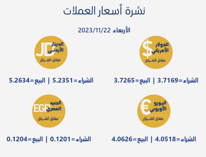 رام الله 22-11-2023 وفا- جاءت أسعار العملات مقابل الشيقل الإسرائيلي، اليوم الأربعاء، حسب سلطة النقد، على النحو التالي:
