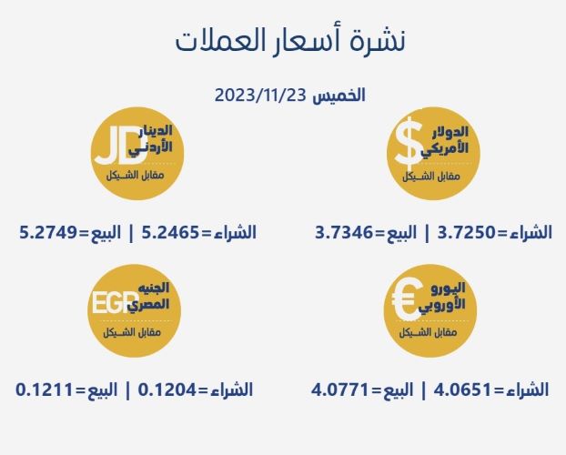 رام الله 23-11-2023 وفا- جاءت أسعار العملات مقابل الشيقل الإسرائيلي، اليوم الخميس، حسب سلطة النقد، على النحو التالي: