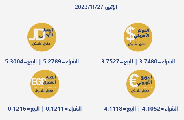 رام الله 27-11-2023 وفا- جاءت أسعار صرف العملات مقابل الشيقل الإسرائيلي، اليوم الإثنين، بحسب سلطة النقد الفلسطينية، على النحو التالي: