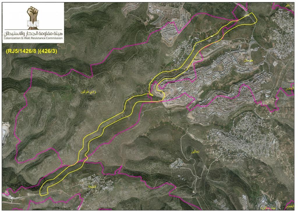 وأفاد مدير مكتب هيئة مقاومة الجدار والاستيطان في بيت لحم حسن بريجية لمراسلنا، باستيلاء قوات الاحتلال، وفق قرار عسكري حمل الرقم RJ5 -465-3-8 على (1500) دونم، من أراضي حوسان وواد فوكين والجبعة، لصالح شق طريق استعماري يمتد من خلة العزراوي في قرية حوسان مرورا بأراضي القرية ثم واد فوكين والجبعة، وصولا الى معبر هاله المحاذي لبلدة صوريف والجبعة شمال غرب الخليل.