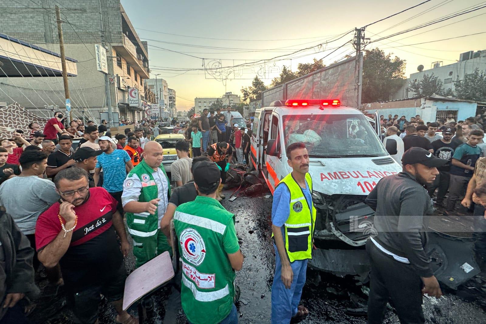 رام الله 4-11-2023 وفا- قالت جمعية الهلال الأحمر الفلسطيني الليلة، إن طيران الاحتلال الإسرائيلي استهدف موكب الإسعاف الذي خرج من مجمع الشفاء الطبي لنقل مصابين إلى معبر رفح، عصر الجمعة، مرتين، الأولى على بعد كيلو متر واحد من مستشفى الشفاء والثانية على بوابته.