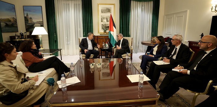 باريس 8-11-2023 وفا- بحث رئيس الوزراء محمد اشتية مع المفوض العام لوكالة الأمم المتحدة لغوث وتشغيل اللاجئين الفلسطينيين "الأونروا" فيليب لازاريني، تطورات استمرار عدوان الاحتلال على أهلنا في قطاع غزة، وبذل الجهود على المستويات كافة من أجل الوقف الفوري لإطلاق النار وإدخال المساعدات الإغاثية والطبية وعلاج الجرحى.