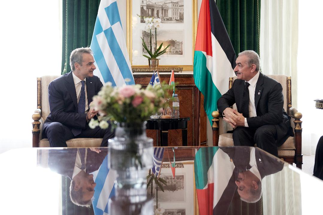 باريس 9-11-2023 وفا- التقى رئيس الوزراء محمد اشتية، اليوم الخميس، في العاصمة الفرنسية باريس، رئيس الوزراء اليوناني كيرياكوس ميتسوتاكيس، بحضور سفيرة فلسطين لدى فرنسا هالة أبو حصيرة.
