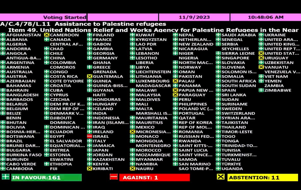 نيويورك 9-11-2023 وفا- اعتمدت اللجنة الرابعة التابعة للجمعية العامة المعنية بالمسائل السياسية وإنهاء الاستعمار في الأمم المتحدة، اليوم الخميس، قرارات متعلقة بالقضية الفلسطينية بأغلبية ساحقة، وعلى رأسها القرار المعني بالدعم للاجئي فلسطين، الذي يشمل وكالة "الأونروا".