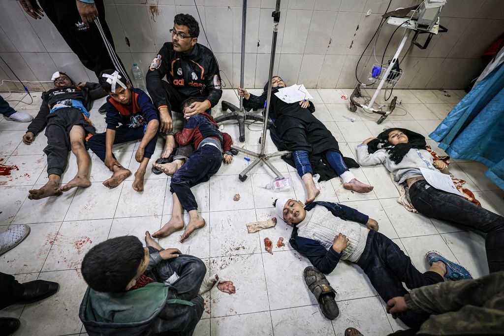 وفي المستشفى الأهلي، كان الفريق يسير في ساحته حيث تراكمت جثث ملفوفة بأغطية بيضاء، فيما كان يسمع صوت إطلاق نار على مقربة من الموقع، وفق ما أفاد كيسي صحفيين من رفح في جنوب غزة.