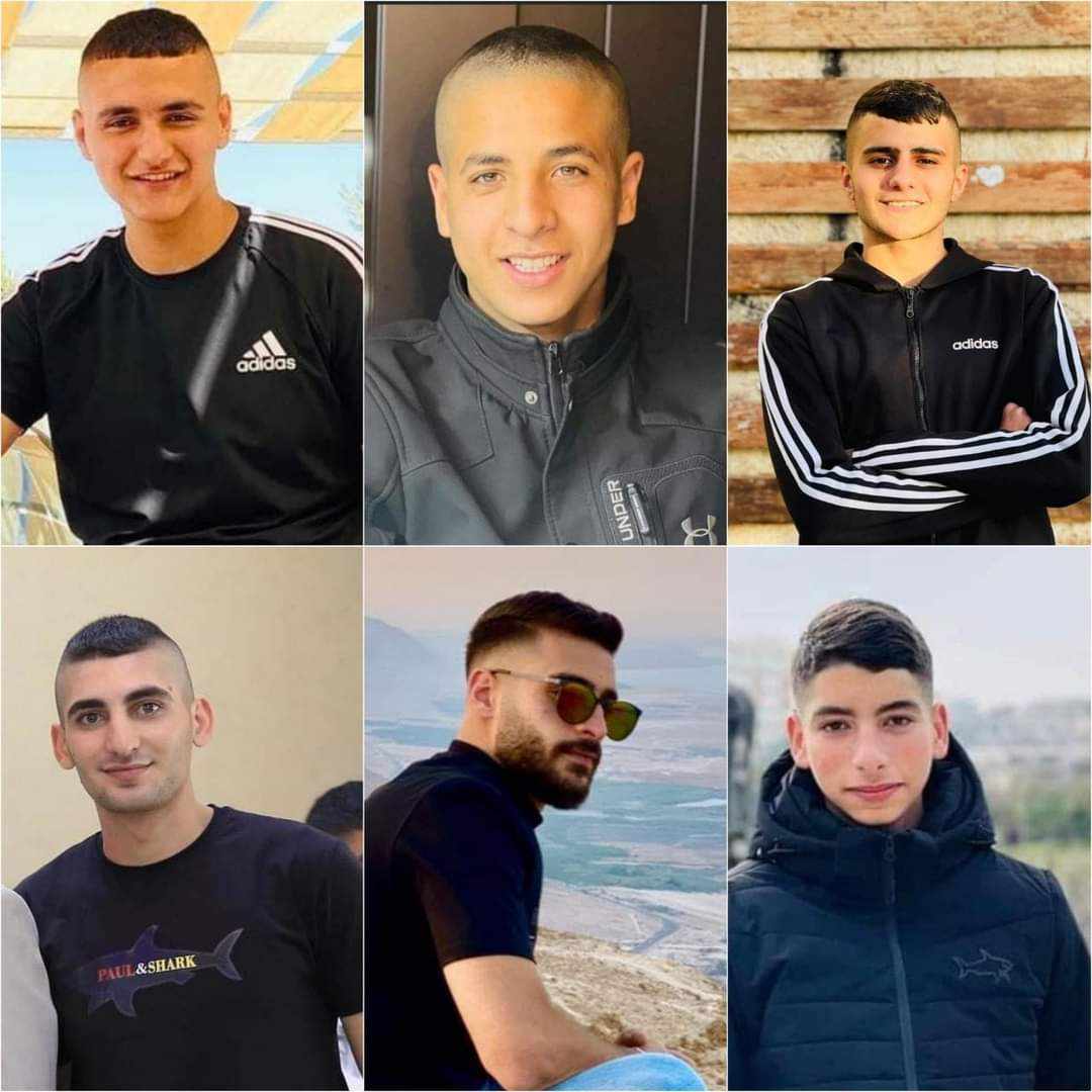 والشهداء هم: أحمد أنور حمارشة (19 عاما)، وأحمد عبد الرحمن عيسى (19 عاما)، وادهم محمد فحماوي (23 عاما)، ويزن احمد وحيد فحماوي (23 عاما)، وفارس حسام فحماوي (29 عاما)، وحمزة أحمد مصطفى فحماوي (17 عاما)، فيما اصيب شاب (24 عاما) بجروح خطيرة بالرأس وصفت حالته بالحرجة.