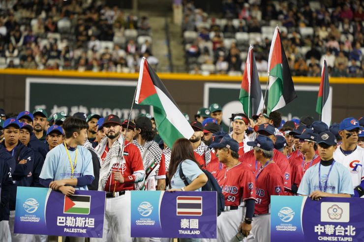 وحظي منتخبنا الوطني للبيسبول، بمتابعة واهتمام من المشاركين والحاضرين، أثناء رفعه العلم الفلسطيني في حفل افتتاح بطولة آسيا للبيسبول.