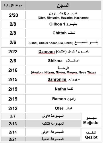 جنين 1-2-2023 وفا- أعلنت اللجنة الدولية للصليب الأحمر، اليوم الأربعاء، برنامج زيارات أسرى محافظتي جنين وطوباس، في سجون الاحتلال، لشهر شباط الجاري، وذلك وفق البرنامج التالي: