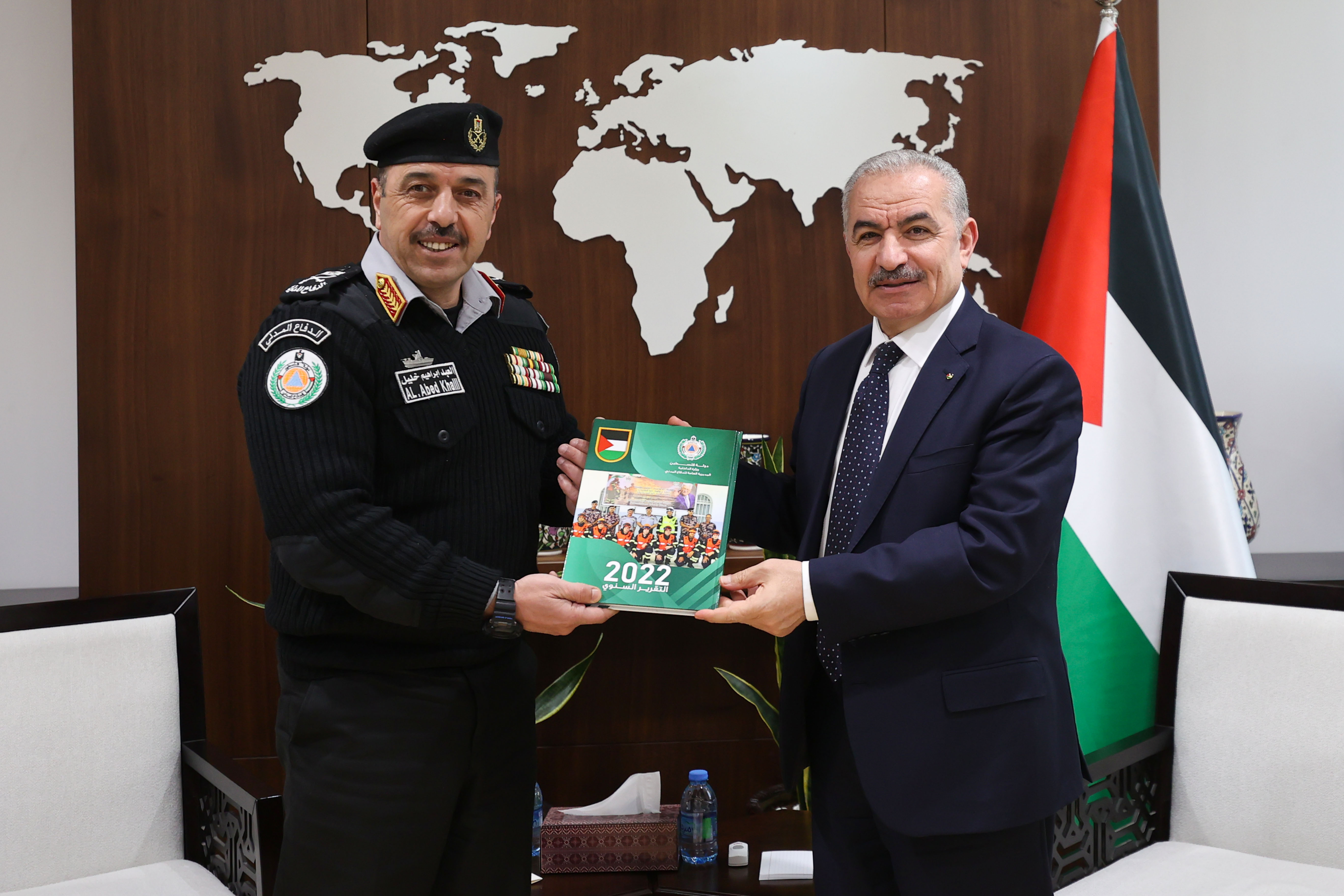 رام الله 13-2-2023 وفا- تسلّم رئيس الوزراء محمد اشتية تقرير الدفاع المدني السنوي عن العام 2022، وذلك خلال استقباله، مساء اليوم الإثنين، في مكتبه برام الله، مدير عام الدفاع المدني اللواء العبد إبراهيم خليل.