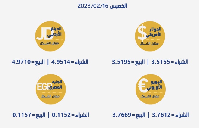رام الله 16-2-2023 وفا- جاءت أسعار العملات مقابل الشيقل الإسرائيلي، اليوم الخميس، حسب سلطة النقد، على النحو التالي: