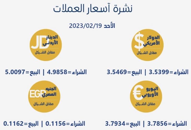 رام الله 19-2-2023 وفا- جاءت أسعار العملات مقابل الشيقل الإسرائيلي، اليوم الأحد، حسب سلطة النقد، على النحو التالي: