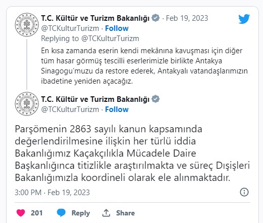 وزارة الثقافة والسياحة التركية، أكدت أمس، إن إدارة مكافحة التهريب باشرت التحقيق بحيثيات القضية في نطاق القانون رقم 2863، وأنه سيتم التعامل معها بالتنسيق مع وزارة الخارجية التركية، واتخاذ القرارات اللازمة.