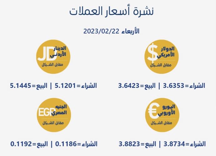 رام الله 22-2-2023 وفا- جاءت أسعار العملات مقابل الشيقل الإسرائيلي، اليوم الأربعاء، حسب سلطة النقد، على النحو التالي: