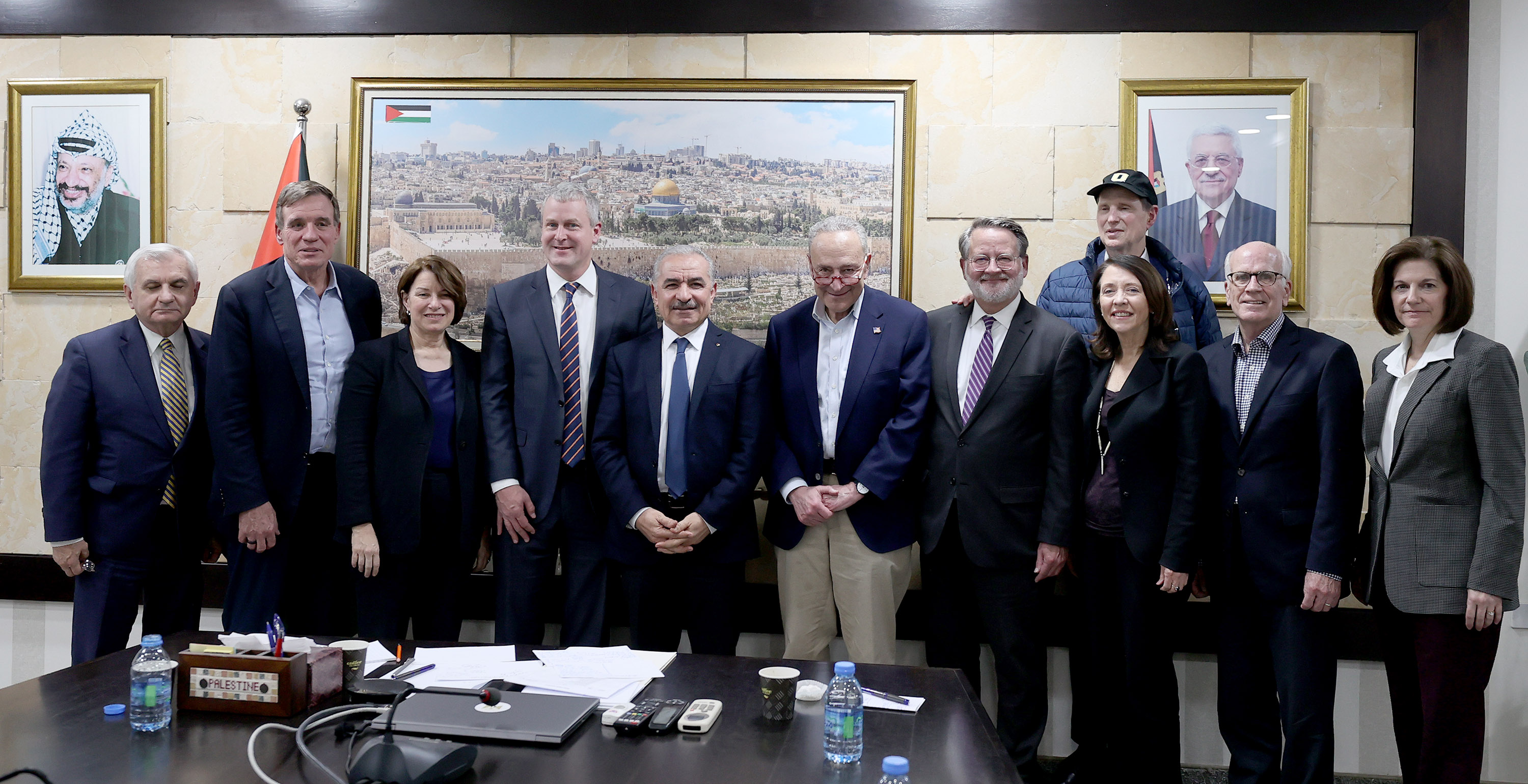 رام الله 24-2-2023 وفا- استقبل رئيس الوزراء محمد اشتية، اليوم الجمعة، وفدا من مجلس الشيوخ الأميركي برئاسة السيناتور تشاك شومر، زعيم الأغلبية في مجلس الشيوخ.