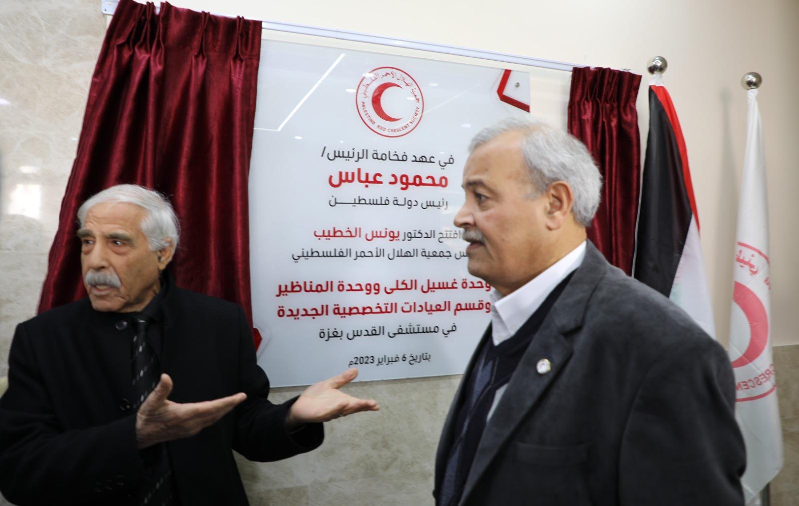 غزة 6-2-2023 وفا- افتتح رئيس جمعية الهلال الأحمر الفلسطيني يونس الخطيب، برفقة محافظ غزة ابراهيم ابو النجا، وعدد من الشركاء في الحركة الدولية للصليب الأحمر والهلال الأحمر، وممثلين عن الفصائل الوطنية، وشخصيات اعتبارية، وحدتي غسيل الكلى، والمناظير، وقسم العيادات التخصصية الجديدة في مستشفى القدس، بمحافظة غزة، والذي من المقرر أن تساند القطاع الصحي في المحافظات الجنوبية، بقدرات طبية واسعة، وتجهيزات طبية حديثة.