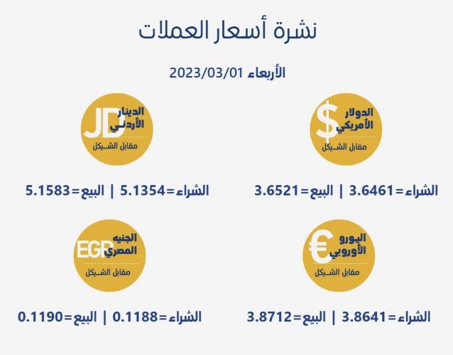 رام الله 1-3-2023 وفا- جاءت أسعار العملات مقابل الشيقل الإسرائيلي، اليوم الأربعاء، حسب سلطة النقد، على النحو التالي: