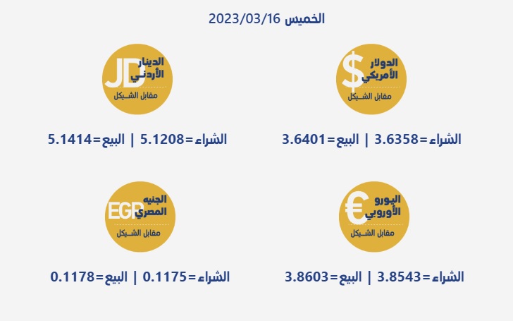 رام الله 16-3-2023 وفا- جاءت أسعار العملات مقابل الشيقل الإسرائيلي، اليوم الخميس، حسب سلطة النقد، على النحو التالي: