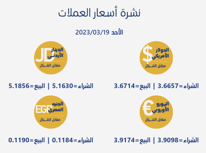 رام الله 19-3-2023 وفا- جاءت أسعار العملات مقابل الشيقل الإسرائيلي، اليوم الاحد، حسب سلطة النقد، على النحو التالي: