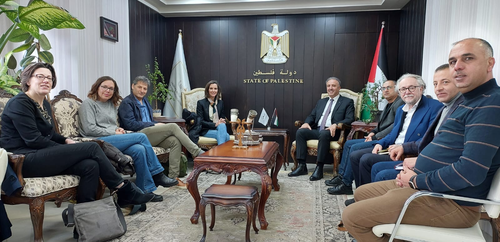 رام الله 20-3-2023 وفا- استقبل المشرف العام على الإعلام الرسمي، الوزير أحمد عساف، اليوم الإثنين، وفدا من القناة التلفزيونية البريطانية الرابعة برئاسة المديرة التنفيذية للقناة اليكس ماهون.