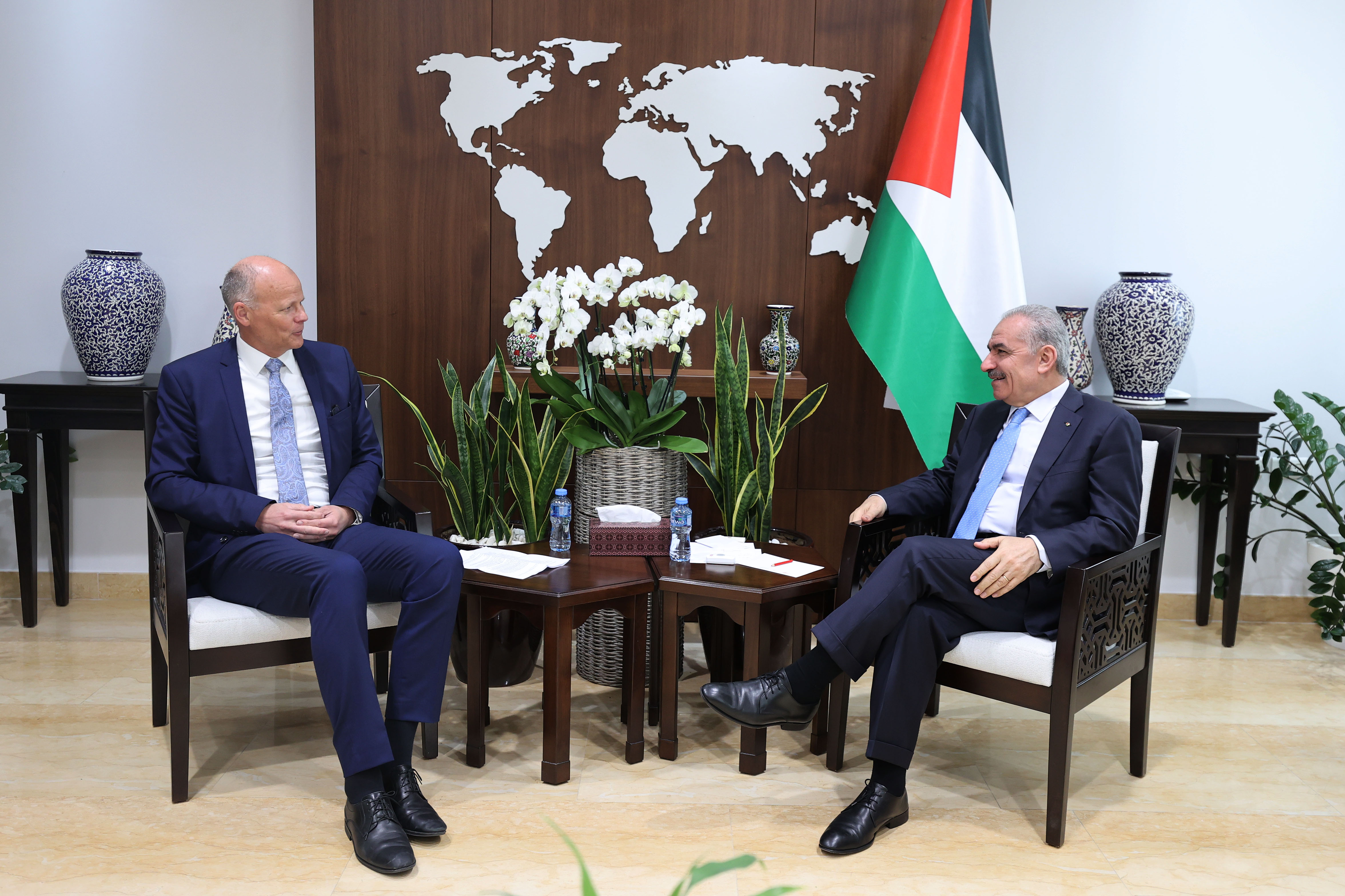 رام الله 22-3-2023 وفا- التقى رئيس الوزراء محمد اشتية، اليوم الأربعاء، في مكتبه برام الله، ممثل البنك الدولي لدى فلسطين ستيفان إمبلاد، حيث بحث معه آخر التطورات السياسية والاقتصادية، وتعزيز التعاون، ودعم المشاريع التنموية في فلسطين.