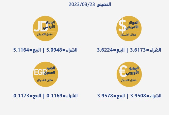 رام الله 23-3-2023 وفا- جاءت أسعار العملات مقابل الشيقل الإسرائيلي، اليوم الخميس، حسب سلطة النقد، على النحو التالي: