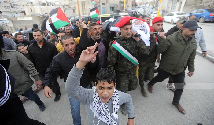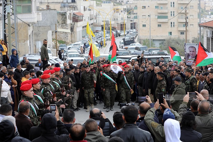 الخليل 26-3-2023 وفا- شيعت جماهير غفيرة في بلدة يطا، بجنازة عسكرية، اليوم الأحد، جثمان الشهيد الأسير أحمد بدر عبد الله أبو علي بعد تسليم جثمانه اليوم.