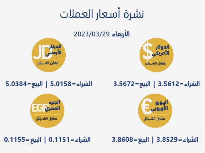 رام الله 29-3-2023 وفا- جاءت أسعار العملات مقابل الشيقل الإسرائيلي، اليوم الأربعاء، حسب سلطة النقد، على النحو التالي: