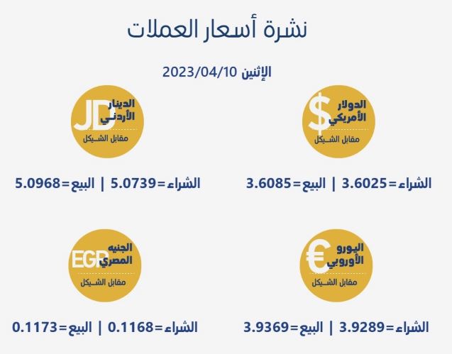 رام الله 10-4-2023 وفا- جاءت أسعار العملات مقابل الشيقل الإسرائيلي، اليوم الإثنين، حسب سلطة النقد، على النحو التالي: