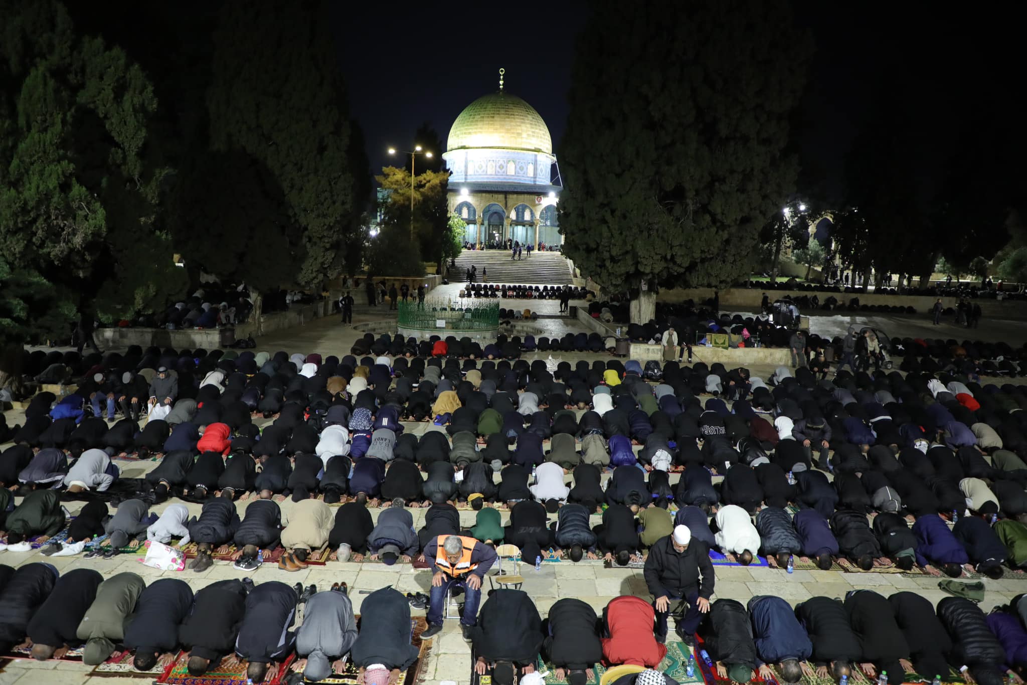 القدس 11-4-2023 وفا- أدى نحو 20 ألف مصلٍّ صلاتي العشاء والتراويح في رحاب المسجد الأقصى المبارك، مساء اليوم الثلاثاء، رغم الإجراءات العسكرية المشددة التي يفرضها الاحتلال الإسرائيلي على وصول المصلين إلى المسجد، وعند أبوابه.