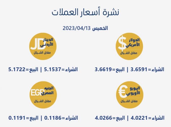 رام الله 13-4-2023 وفا- جاءت أسعار العملات مقابل الشيقل الإسرائيلي، اليوم الخميس، حسب سلطة النقد، على النحو التالي: