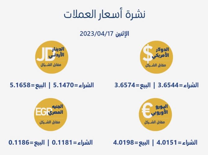 رام الله 17-4-2023 وفا- جاءت أسعار العملات مقابل الشيقل الإسرائيلي، اليوم الإثنين، حسب سلطة النقد، على النحو التالي: