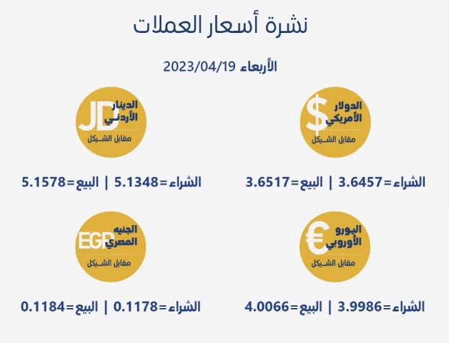 رام الله 19-4-2023 وفا- جاءت أسعار العملات مقابل الشيقل الإسرائيلي، اليوم الأربعاء، حسب سلطة النقد، على النحو التالي: