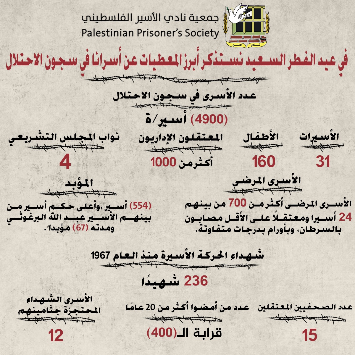 واستعرض نادي الأسير في بيان صدر عنه، اليوم الجمعة، لمناسبة عيد الفطر، أبرز المعطيات عن الأسرى، الذين يحرمهم الاحتلال على مدار سنوات وعقود من التواجد مع عائلاتهم وأبنائهم.