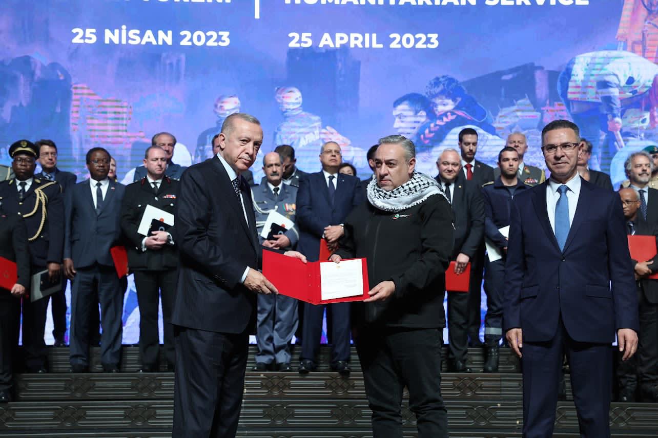 الرئيس التركي يكرم دولة فلسطين ويمنح فريقها للتدخل والاستجابة العاجلة وسام الجمهورية للتضحية وشهادة التقدير