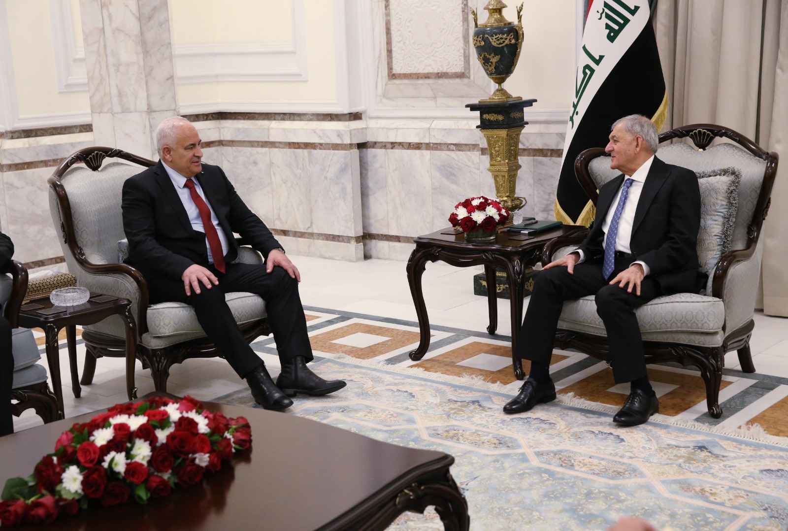 من ناحيته، نقل اللواء هب الريح تحيات رئيس دولة فلسطين محمود عباس إلى رئيس الجمهورية العراقية، كما حمل تحيات الرئيس العراقي وتمنياته للشعب الفلسطيني بالاستقرار والسلام.