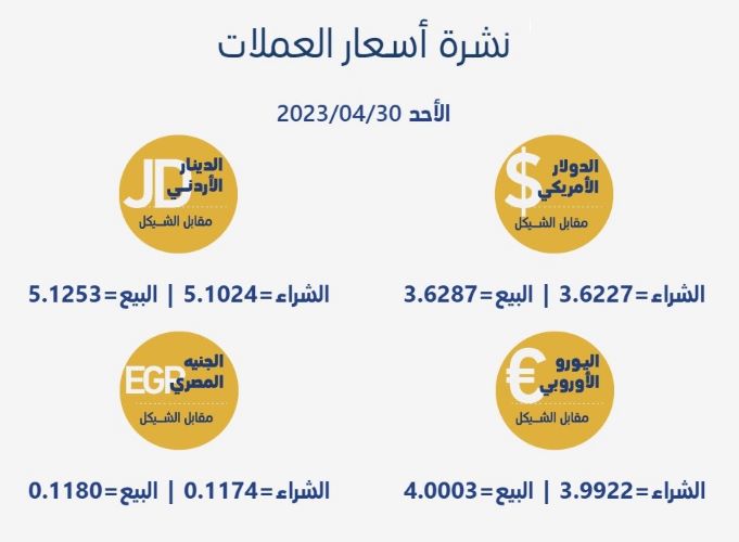 رام الله 30-4-2023 وفا- جاءت أسعار العملات مقابل الشيقل الإسرائيلي، اليوم الأحد، حسب سلطة النقد، على النحو التالي: