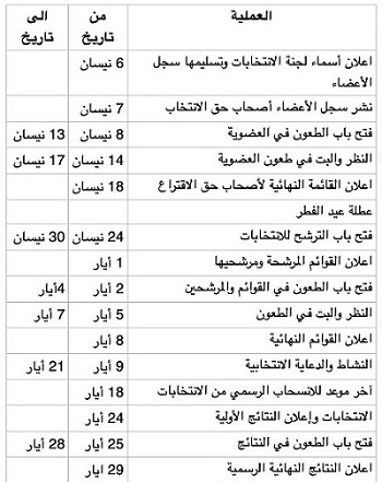 ووفقاً لنصوص النظام الداخلي للنقابة، فإن جدول العملية الانتخابية التي انطلقت يكون حسب التواريخ المبينة في الجدول التالي: