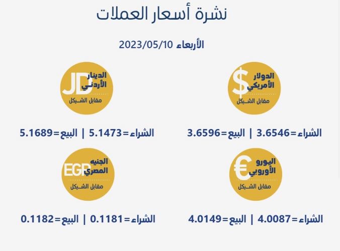 رام الله 10-5-2023 وفا- جاءت أسعار العملات مقابل الشيقل الإسرائيلي، اليوم الأربعاء، حسب سلطة النقد، على النحو التالي: