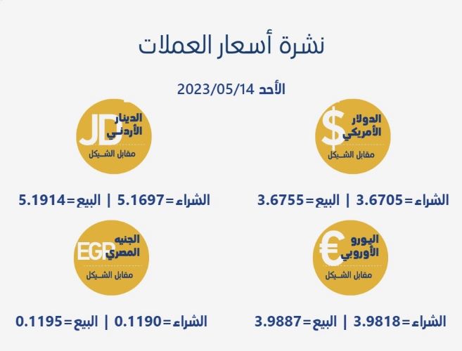 رام الله 14-5-2023 وفا- جاءت أسعار العملات مقابل الشيقل الإسرائيلي، اليوم الأحد، حسب سلطة النقد، على النحو التالي: