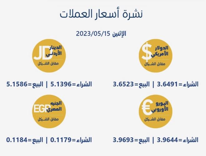 رام الله 15-5-2023 وفا- جاءت أسعار العملات مقابل الشيقل الإسرائيلي، اليوم الإثنين، حسب سلطة النقد، على النحو التالي: