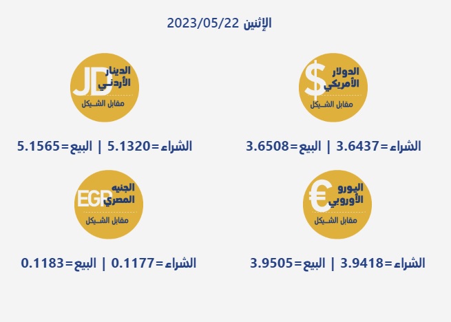 رام الله 22-5-2023 وفا- جاءت أسعار العملات مقابل الشيقل الإسرائيلي، اليوم الإثنين، حسب سلطة النقد، على النحو التالي:
