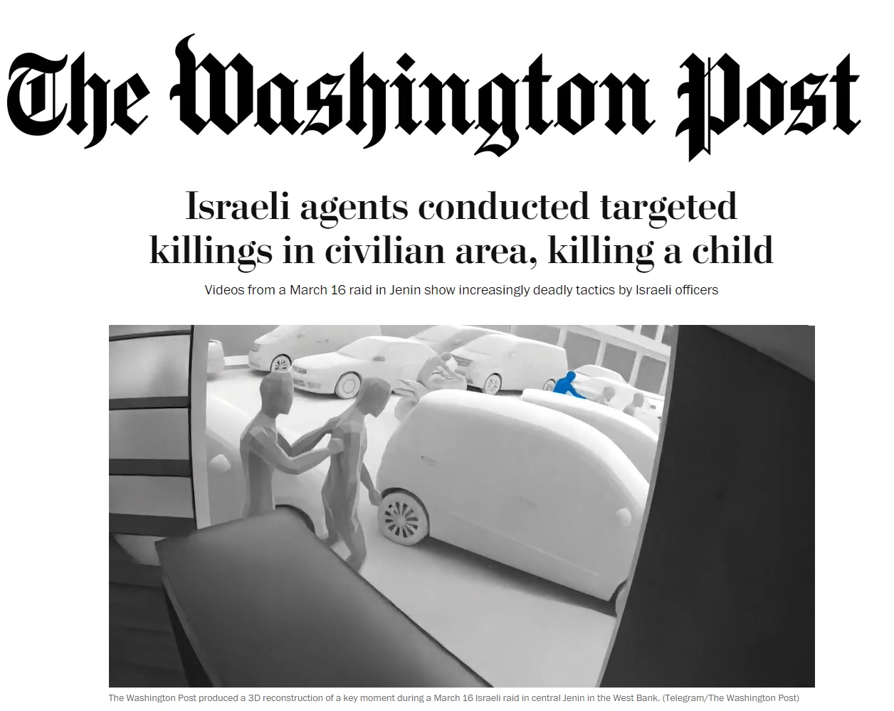 أجرت صحيفة واشنطن مزامنة لـ15 مقطع فيديو للاقتحام الدموي الإسرائيلي لمدينة جنين في نهار 16 آذار الماضي الذي أدى لاستشهاد 4 فلسطينيين، هم نضال خازم، ويوسف شريم، وعمر عوادين، ولؤي الصغيّر، وحصل التحقيق على لقطات فيديو من كاميرات مراقبة من المحلات التجارية المجاورة لمكان اقتحام القوات الخاصة الإسرائيلية، وتحدثت الصحيفة إلى تسعة شهود وحصلت على شهادات من أربعة آخرين لإعادة تصوير الاقتحام بنظام ثلاثي الأبعاد.