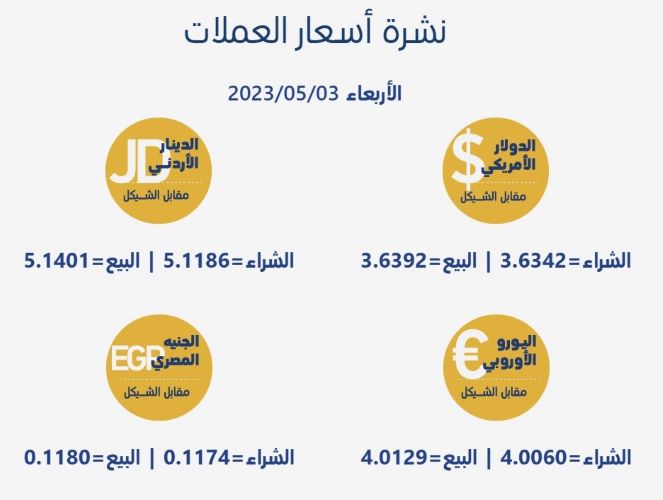 رام الله 3-5-2023 وفا- جاءت أسعار العملات مقابل الشيقل الإسرائيلي، اليوم الأربعاء، حسب سلطة النقد، على النحو التالي: